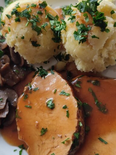 Piec około 30 minut w 170 stopniach, pod koniec zwiększyć temperaturę do 180. Podawać w towarzystwie ziemniaków, pomidora i ogórka w tzw. piramidkę.