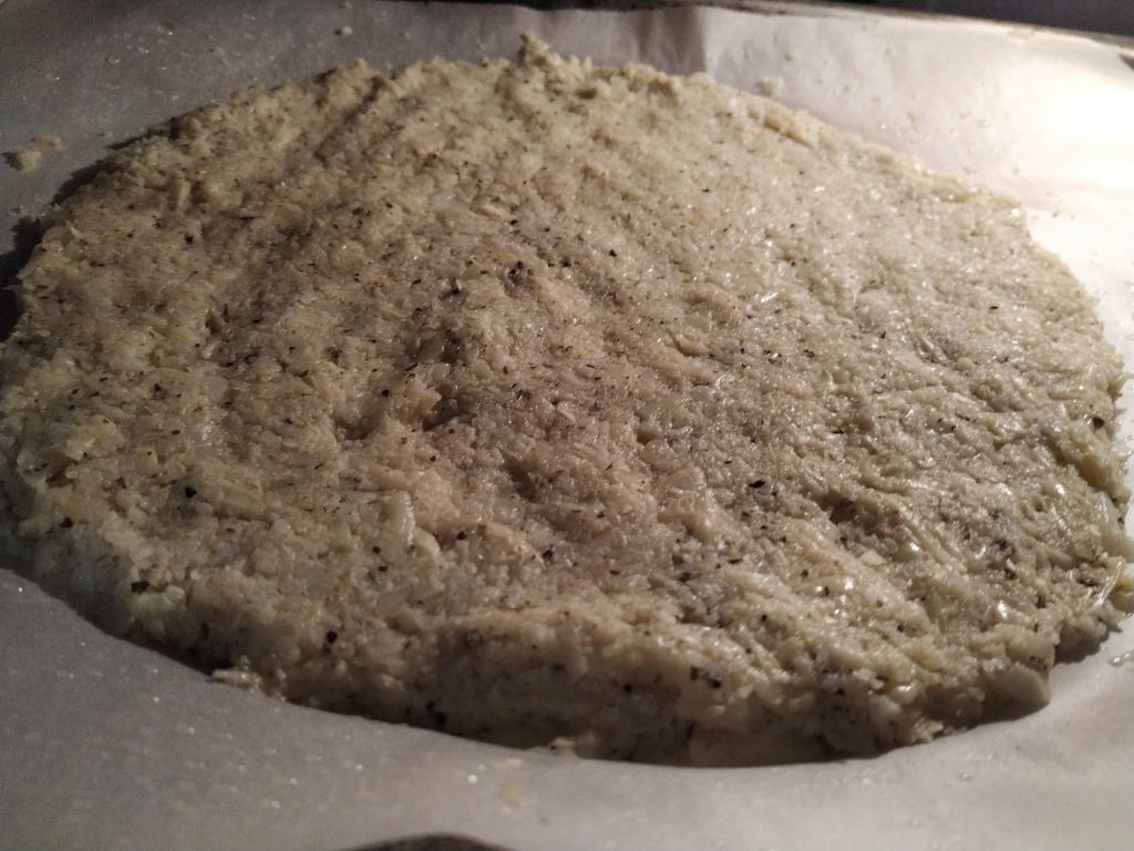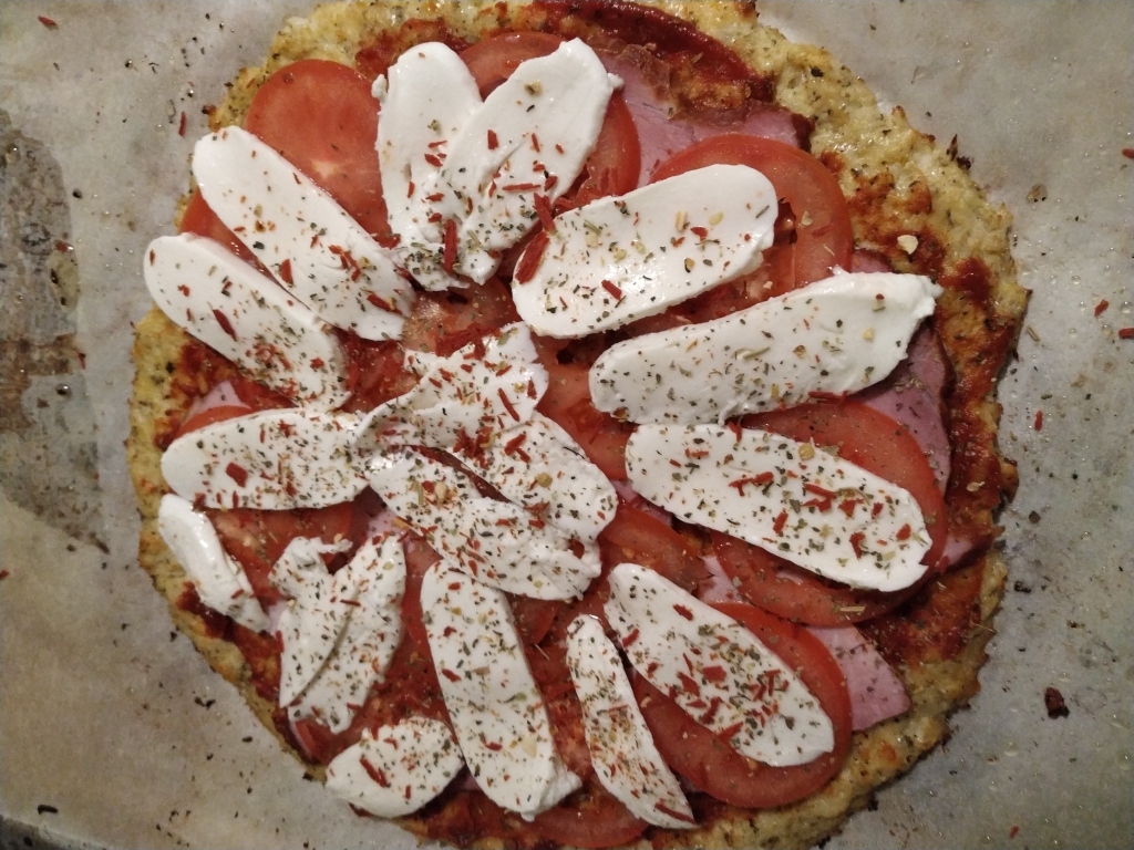 Do suchego kalafiora dodajemy starty ser żółty, jajko, sól, pieprz, zioła i paprykę. Mieszkamy wszystko na jednolitą masę. Wyjmujemy ciasto na blaszkę wyłożoną papierem do pieczenia i formujemy z niego kształt jaki chcemy by uzyskała nasza pizza. Tak uformowane ciasto, które będzie zupełnie inne w swej strukturze, bo dość sypkie, pieczemy w temperaturze 195 stopni 20 minut.
