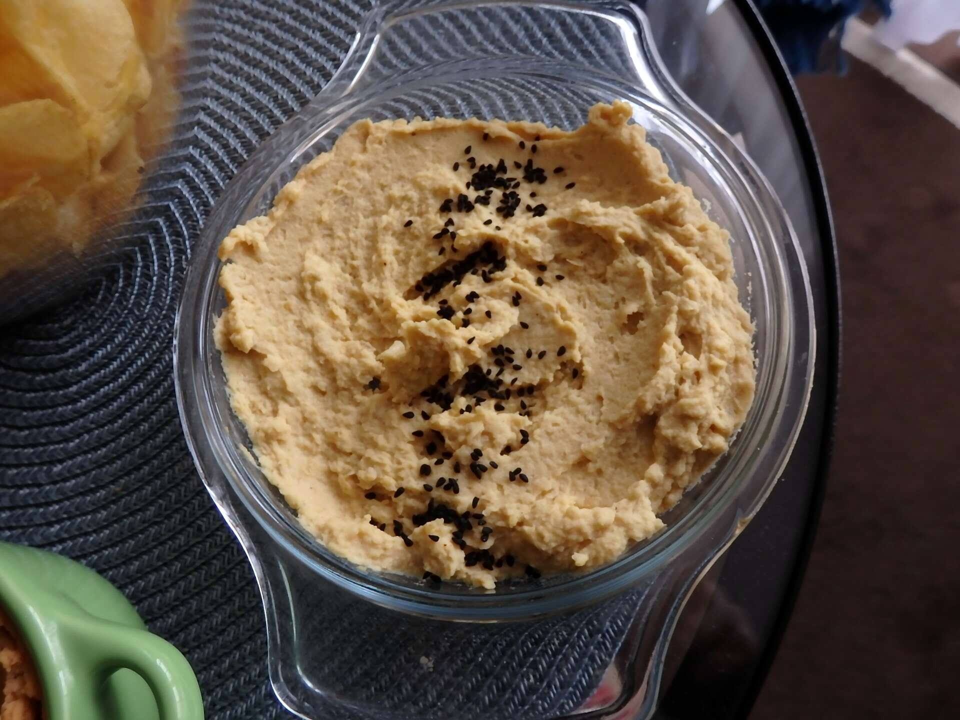 Ciecierzyce wsypujemy do miksera. Dodajemy tahini, oliwę z oliwek, sól, pieprz, czosnek przeciskamy przez praskę, a kmin rozdrabniamy na drobny proszek w moździerzu. Całość miksujemy na gładką masę. Jeśli ciecierzyca nie chce się, zmienilić na głądką masę, to można dodać więcej oliwy lub odrobinę wody.