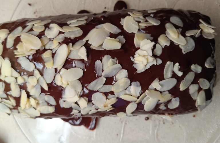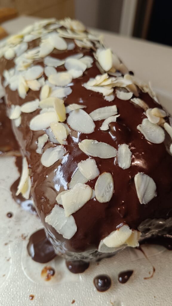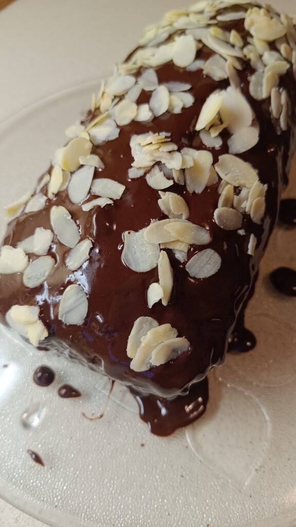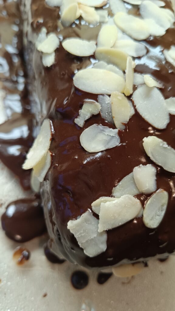 Po upieczeniu ciasta i wystudzeniu, polewamy czekoladą rozpuszczoną w mleku i układamy na wierzchu płatki migdałów. Pyszna przekąska do zabrania na zimowe spacery z termosem pysznej gorącej herbaty.