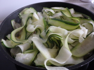 Cebule i suszone pomidory kroimy w kosteczkę. Podsmażamy cebulę na oleju z zalewy z suszonych pomidorów i jak cebula się lekko zrumieni dodajemy suszone pomidory. Cukinie dokładnie myjemy (jeśli macie płyn do mycia warzyw z pestycydów to polecam), następnie obieraczką do warzyw kroimy w cienkie paseczki i dojemy ją do smażonej cebuli i pomidorów. Dusimy całość, aż cukinia zmięknie nieco, ale powinna zostać aldente (na zdjęciu poniżej tagliatelle z cukini, tuż po wrzuceniu na patelnię).