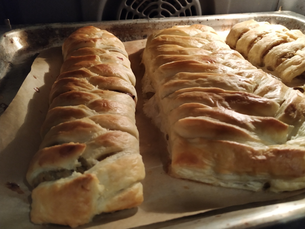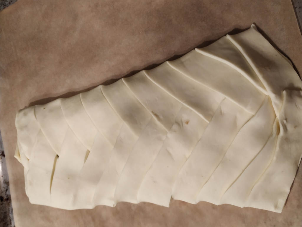 Ciasto francuskie rozwijamy, na środku będzie znajdował się farsz, a oba boki kroimy w jodełkę, która potem będziemy zawijać na farszu. Smarujemy zwinięty warkocz roztrzepanym białkiem lub mlekiem sojowym. Pieczemy około 45 minut w temperaturze 190°C.