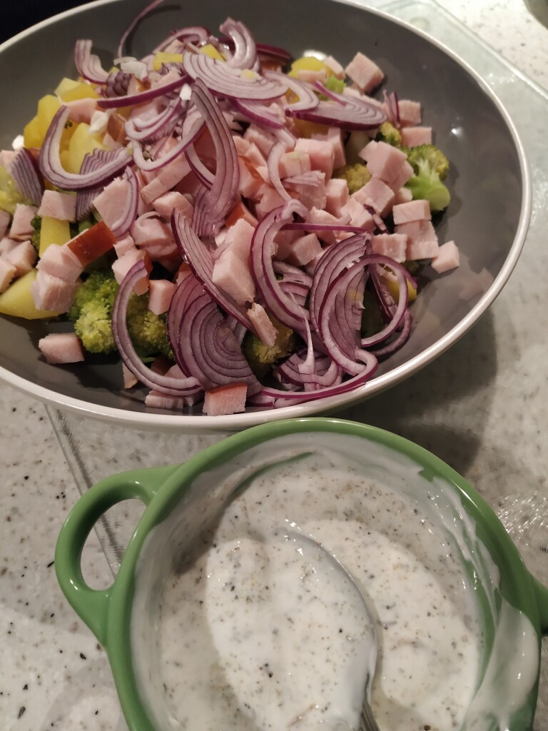 Postanowiłam też wykorzystać warzywa, które gotuję zwykle do obiadu, czyli prosty przepis na sałatkę brokułową, do której kroję w kosteczkę 2 ugotowane ziemniaki, czerwoną cebulę, wędzony filet z indyka i doprawiam jogurtem naturalnym z ziołami prowansalskimi, odrobiną suszonego czosnku i oczywiście solą i pieprzem. Taka sałatka jest idealna na kolację lub na drugi dzień do pracy.