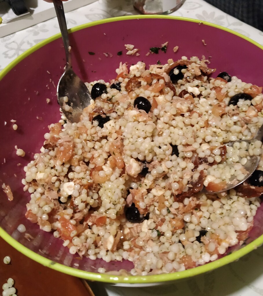 Teraz wymieszaj wszystkie składniki, to znaczy: kuskus, pomidory, mozzarellę, oliwki (pokrój na połówki) z tuńczykiem. Dodaj sos i bazylię (zostaw parę listów do udekorowania na wierzchu).