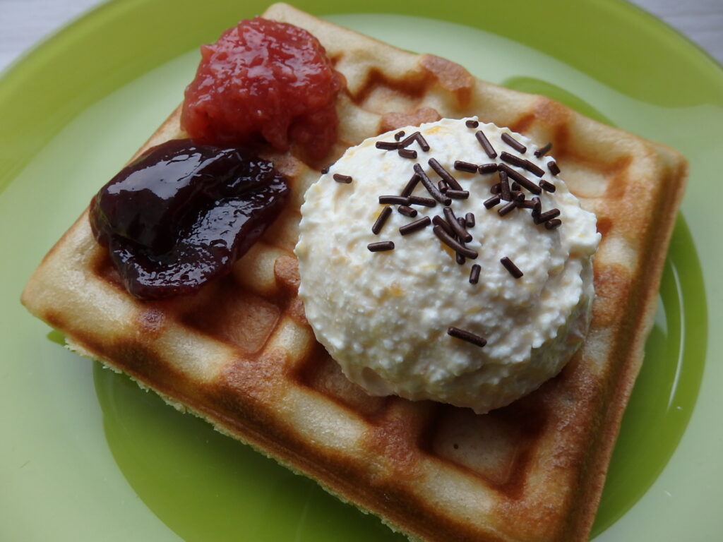 Serek z morelami w syropie to moje dzieło, idealnie pasował do gofrów. Biały ser zmiksowany z morelami na 400 gramów sera około 3-4 połówek morel w zależności o ich wielkości i kilka łyżeczek syropu.