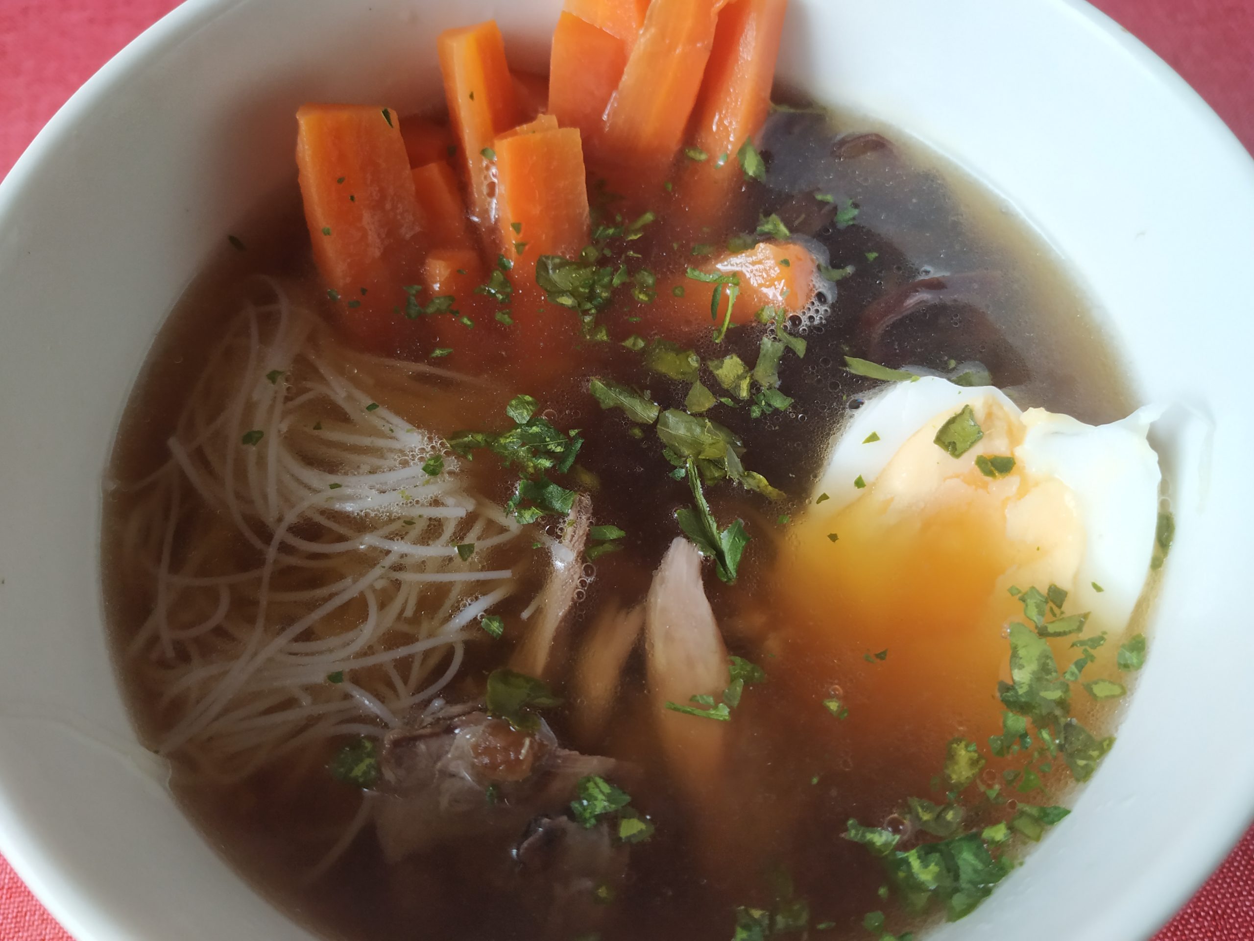 Obgotowałam korpus kaczki, a następnie zmieniłam wodę i dodałam szponder i kurczaka. Doprowadziłam do zagotowania, zszumowałam i wtedy dodałam warzywa. Całość gotowałam około godziny wówczas, wyjechał por, który już znacząco zmienił kolor. Gotowałam łącznie około 3 godzin, po tym czasie mięso z kurczaka praktycznie się rozpada po dotknięcie widelcem. Rosół doprawiłam sosem sojowym. Do miseczki włożyłam gniazdko ugotowanego makaronu ryżowego, jajko przekrojone na pół, marchewkę pokrojoną w słupki, kawałeczki mięsa oraz łyżkę grzybków mun. Wszystko zalałam bulionem delikatnie, żeby składniki się nie wymieszały.
