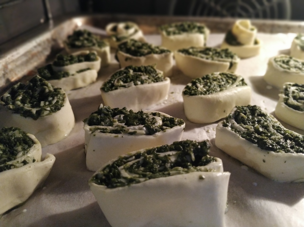 Szpinak podgrzać i doprawić do smaku. Lekko przestudzony szpinak wymieszać ze startym serem żółtym, tak przygotowaną masę rozprowadzić na ciasto francuskie. Następnie zwinąć w rulon i pokroić w 1,5 centymetrowe krążki. Piec 25 minut w 180 stopniach Celsjusza.