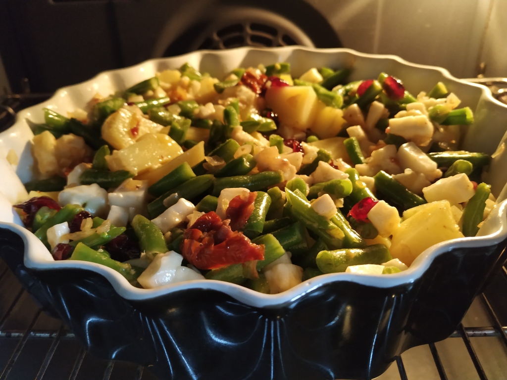 Na dużej patelki przysmażamy cebulę z czosnkiem. Następnie dodajemy suszone pomidory, żurawinę, serek halloumi pokrojony w drobną kostkę, mieszamy i dodajemy fasolkę szparagową.