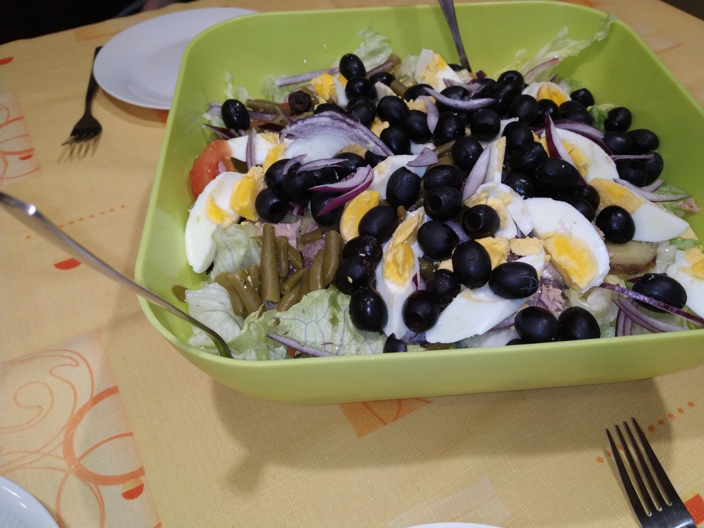 Ziemniaki umyj i ugotuj w mundurkach. Jajka i fasolkę szparagową (jeśli masz świeżą) ugotuj. Wszystkie składniki wystudź i pokrój, jak lubisz na mniejsze kawałki. Tuńczyka odsącz z zalewy. Pokrój anchois, jak również pomidory, celebrę w krążki lub piórka. Sałatę umyj i porwij na kawałeczki.